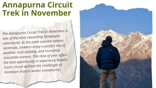 The Annapurna Circuit Trek in November is one of the most rewarding Himalayan adventures. As the peak autumn season continues, trekkers enjoy a perfect mix