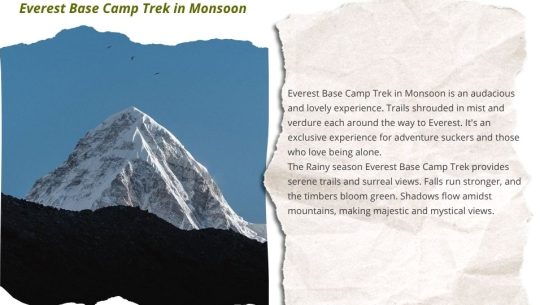 Everest Base Camp Trek in Monsoon is an audacious and lovely experience. Trails shrouded in mist and verdure each around the way to Everest. It's