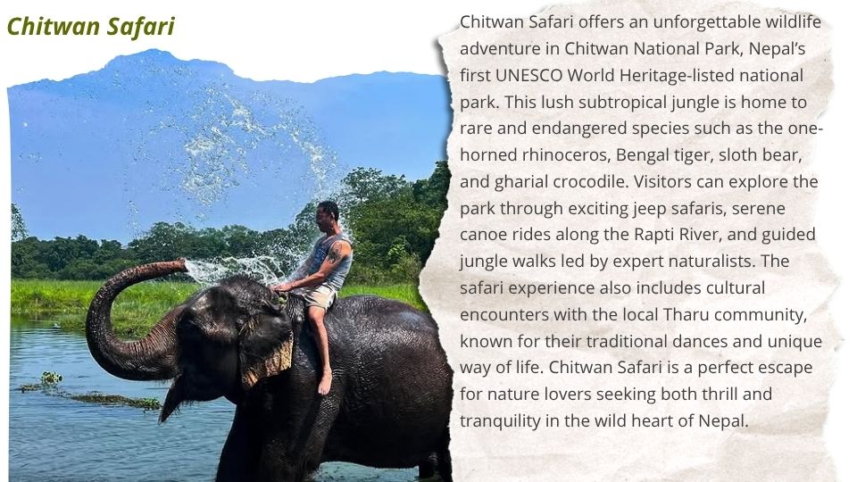 Explore the ancient temples and colorful bazaars within the historic center of Kathmandu. Enjoy a thrilling jungle safari at Chitwan National Park with experienced professionals as guides.