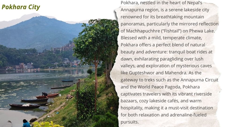 3rd day of your Nepal Visit Package 7 Day on a beautiful drive or flight to Pokhara. A short flight has Himalayan scenery, and the road journey displays green valleys.